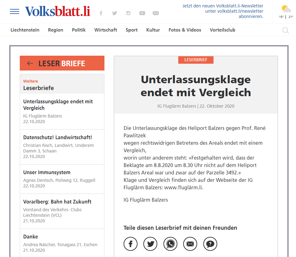 Die Unterlassungsklage des Heliport Balzers gegen Prof. René Pawlitzek wegen rechtswidrigen